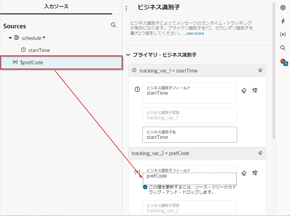 ボックス左側のツリーから 「$prefCode」 を、ボックスの右側に表示されているテーブルの 「プライマリ・ビジネス識別子」 列の2行目にドラッグ&ドロップします。