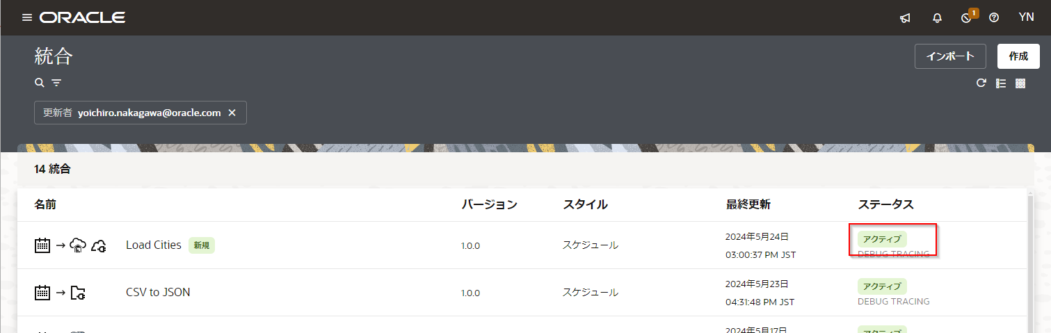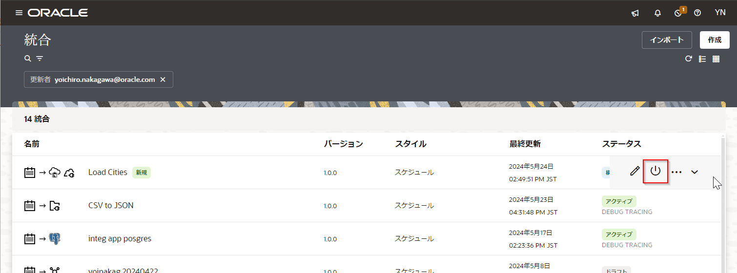 Oracle Integration Cloud で作成した統合を実行するには、まずアクティブ化します。 実行する統合にマウスポインタを合わせ、表示された 「アクティブ化」 アイコンをクリックします。