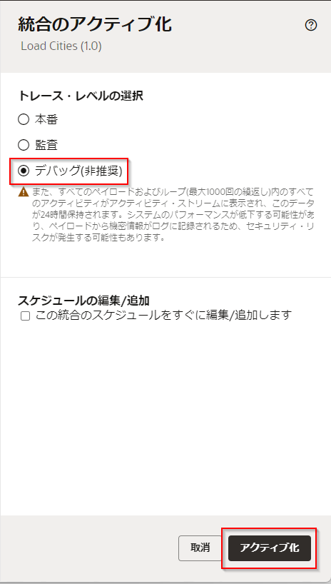 「統合のアクティブ化」 ボックスが表示されます。 「トレース・レベルの選択」を 「デバッグ」 にチェックして、ボックスの右下に表示されている 「アクティブ化」 ボタンをクリックします。