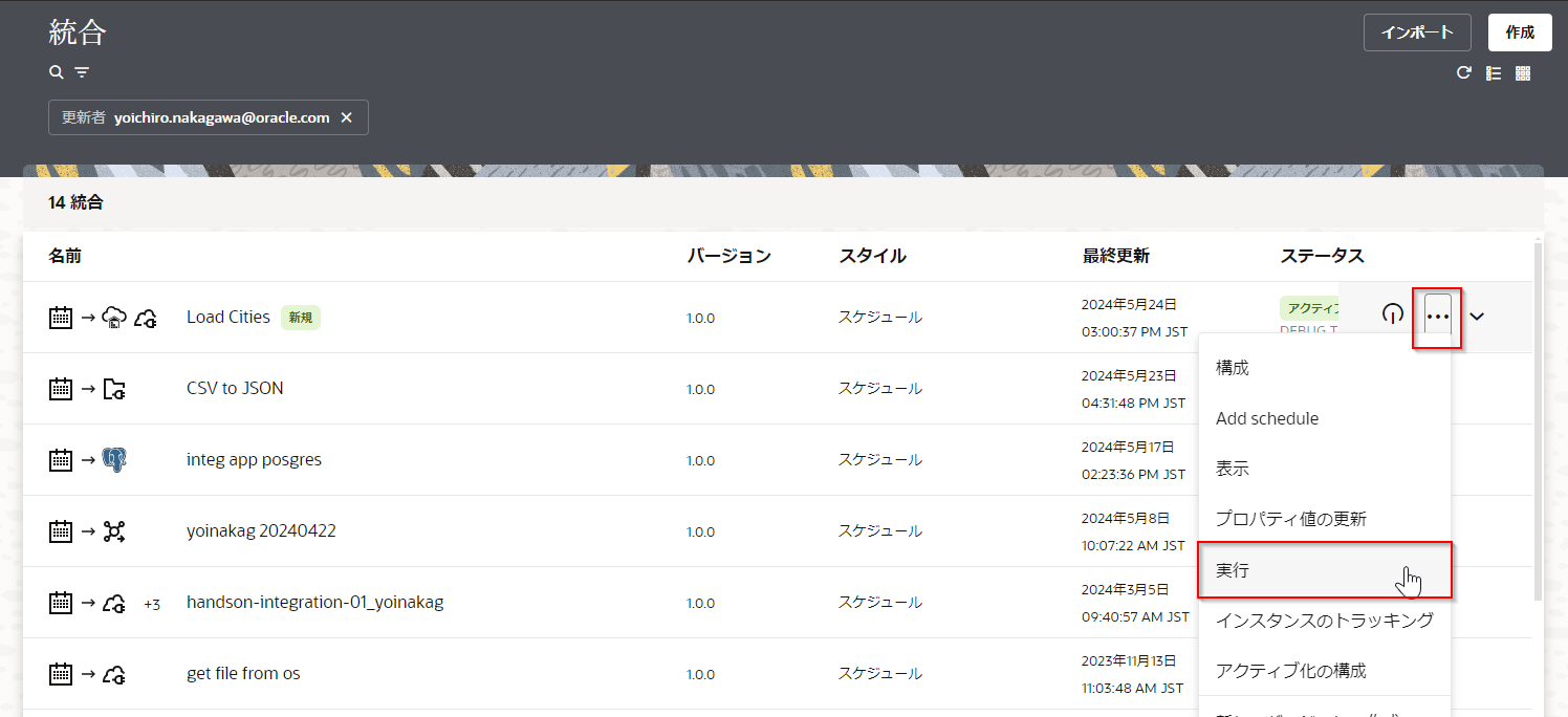 実行する統合にマウスポインタを合わせ、メニューから 「実行」 をクリックします。