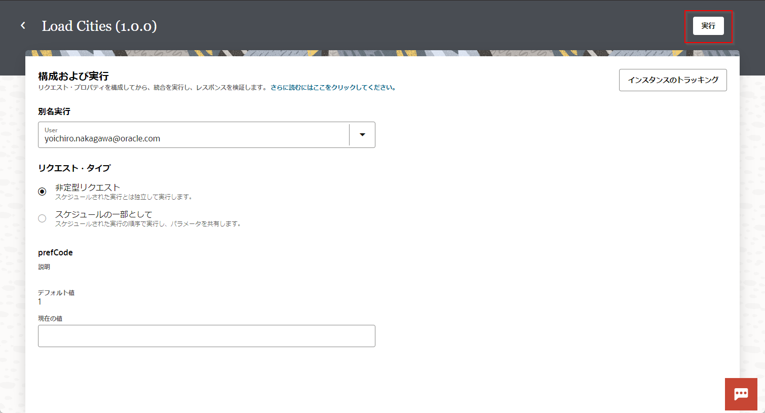今回はデフォルト値をそのまま使用することにして、ページの右上にある 「実行」 ボタンをクリックします。