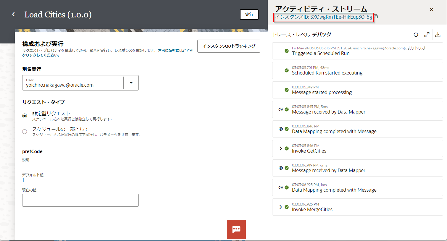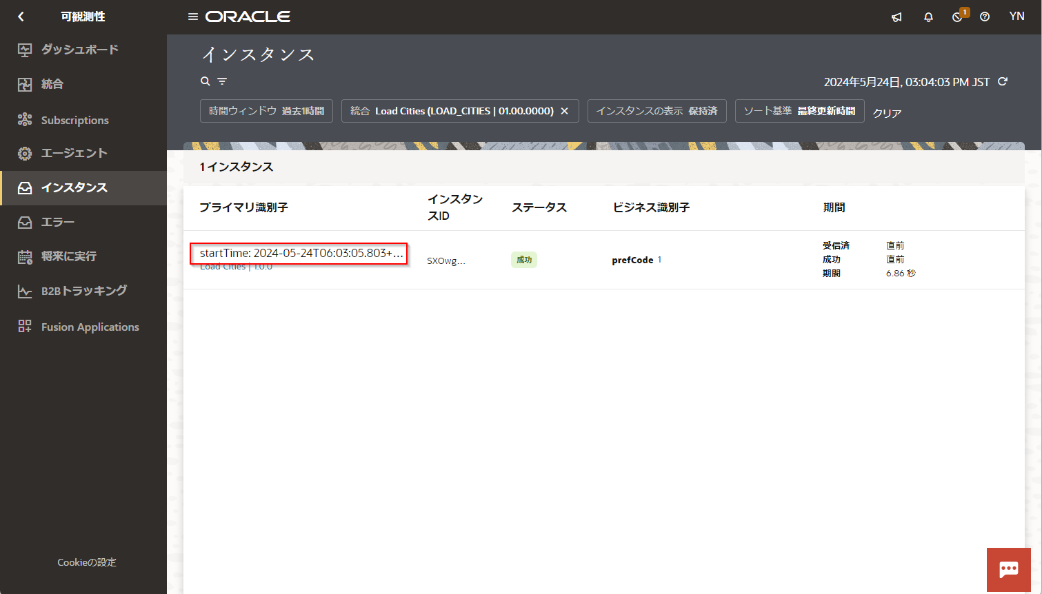 メニューから 「可観測性」-「インスタンス」 に遷移すると実行された統合アプリケーションの一覧が表示されるので、詳細を確認したいインスタンス(実行済みの統合)をクリックします。