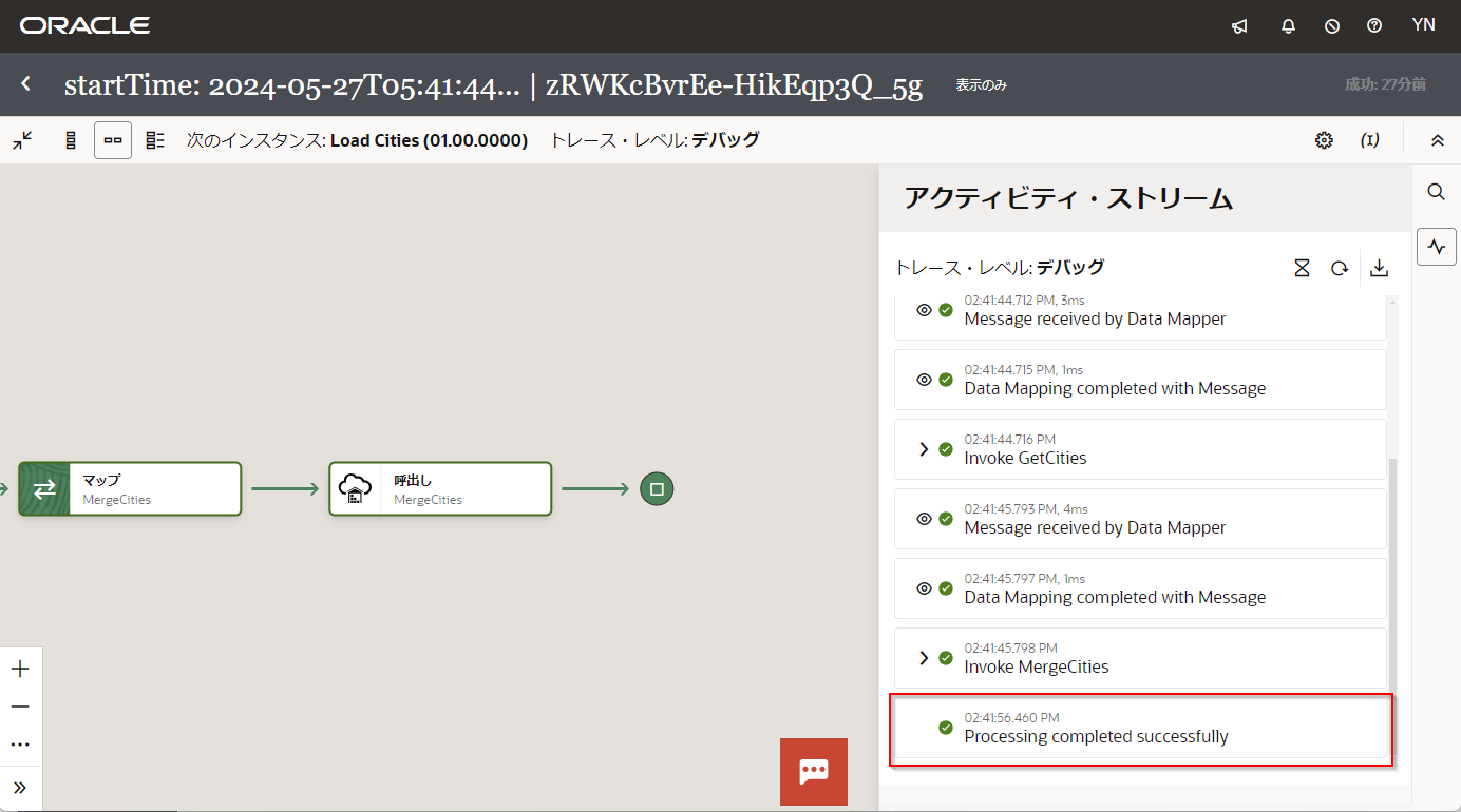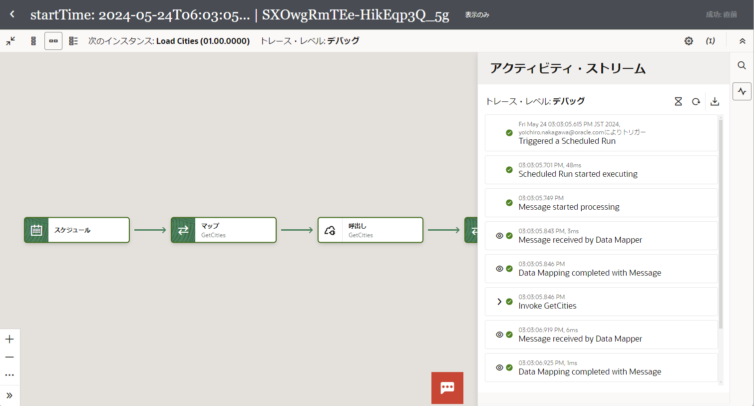 「実行」をクリックするとすぐに右側に「アクティビティ・ストリーム」というブロックが表示され、ここでログレベルの処理状況を確認することができます。