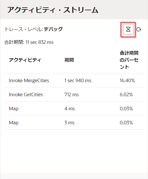 アクティビティ・ストリームにある砂時計のアイコンをクリックすると各処理にかかった時間を確認することもできます。