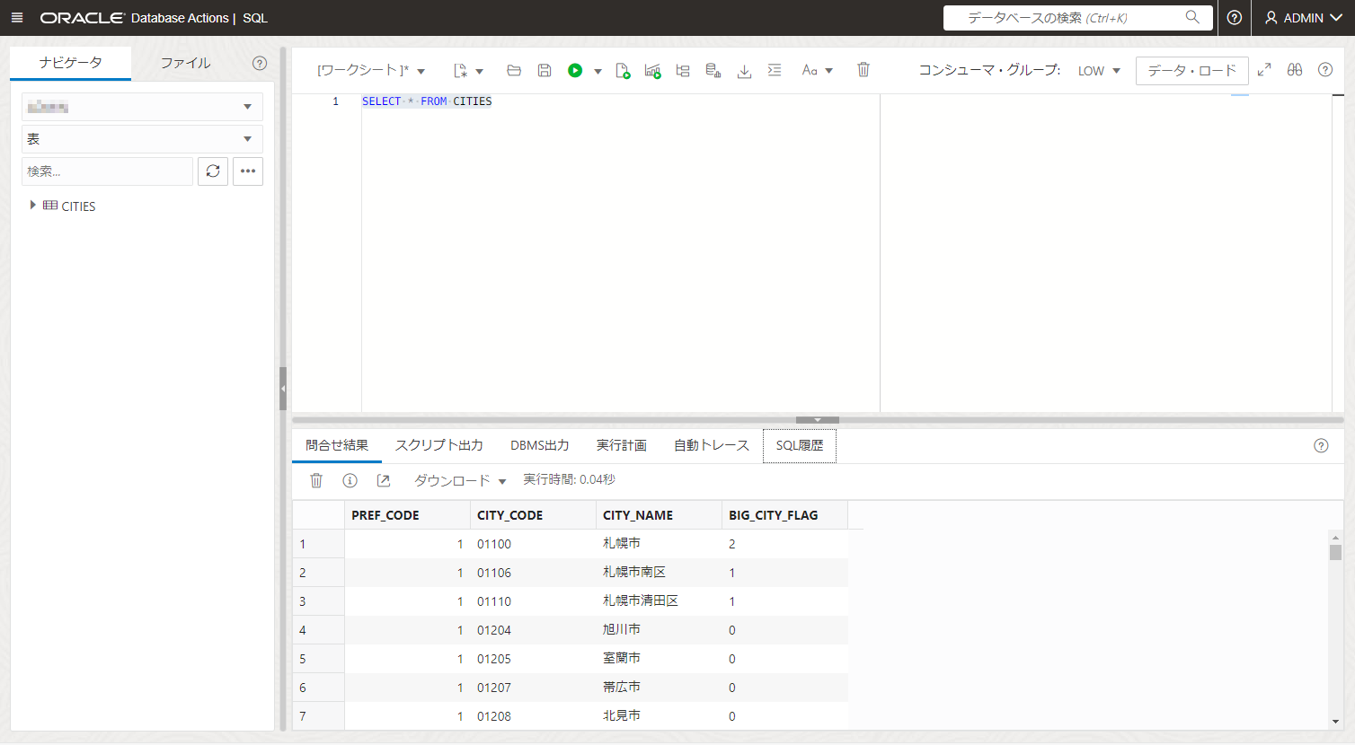 このチュートリアルは、 Oracle Integration Cloud を使用して RESAS-API が提供する市区町村データ を、Oracle ADW 上の CITIES という名前の表に保存してみます。