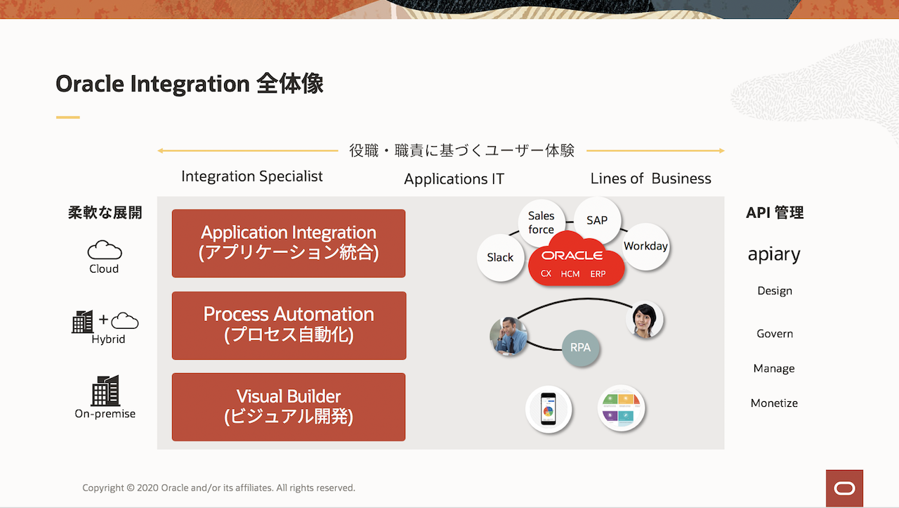 Oracle Integration は、アプリケーションの統合、プロセスの自動化およびビジュアル・アプリケーションの作成を可能にする完全に管理されたサービスです。 OIC は大きく 3 つの機能を提供します。
