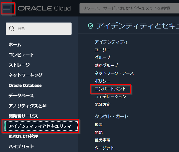 OCI コンソールの左上のメニューをクリックし、アイデンティティとセキュリティ→コンパートメントを選択します。
