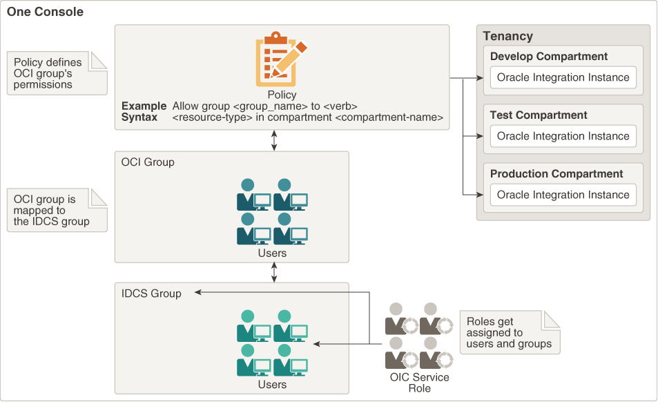 OCI IAM サービスのポリシーを使用して、OIC インスタンスの作成や管理などの権限を制御します。 IDCS を使用して、OIC を利用するユーザーの作成および管理をします。
