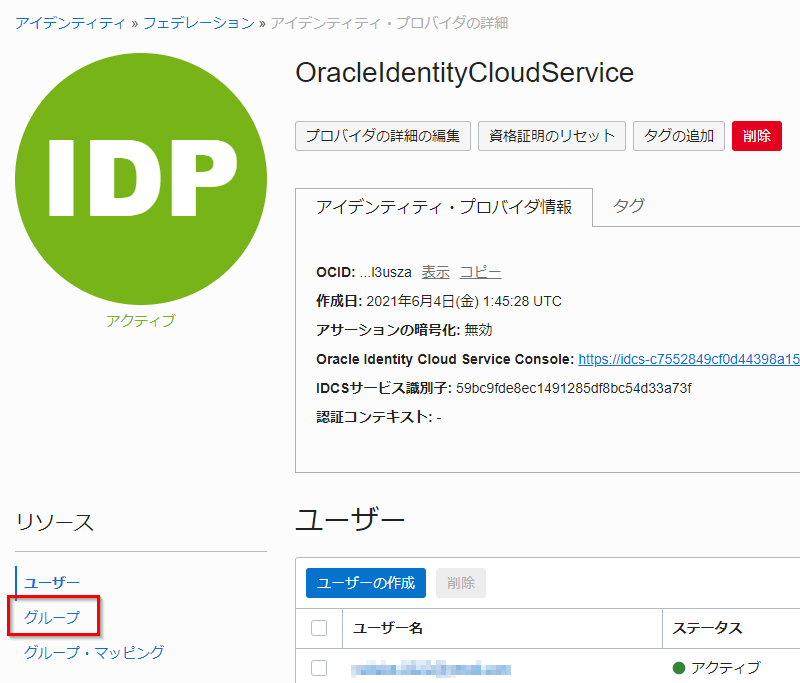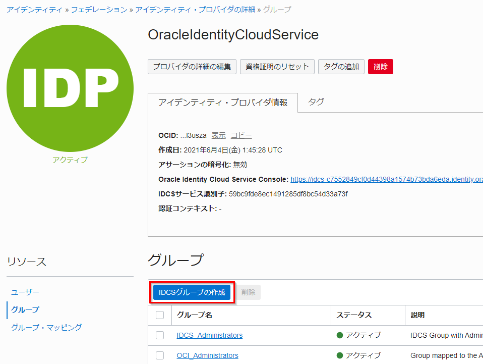 IDCSグループの作成をクリックします。