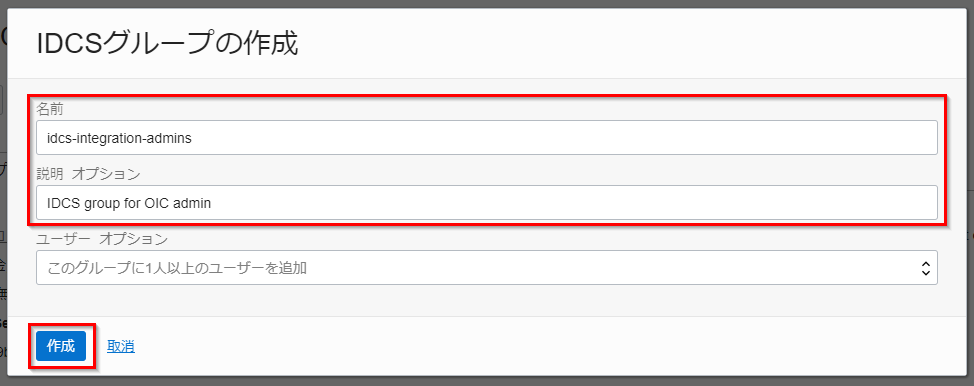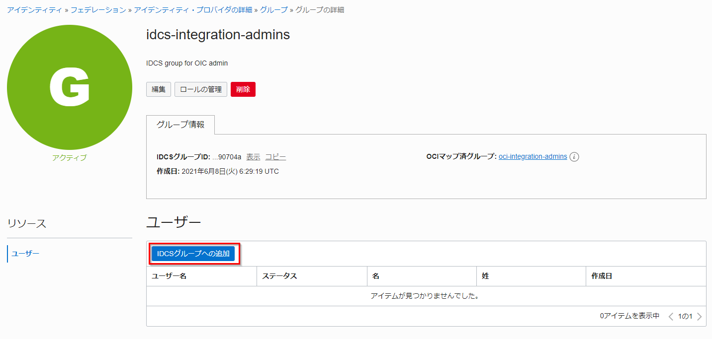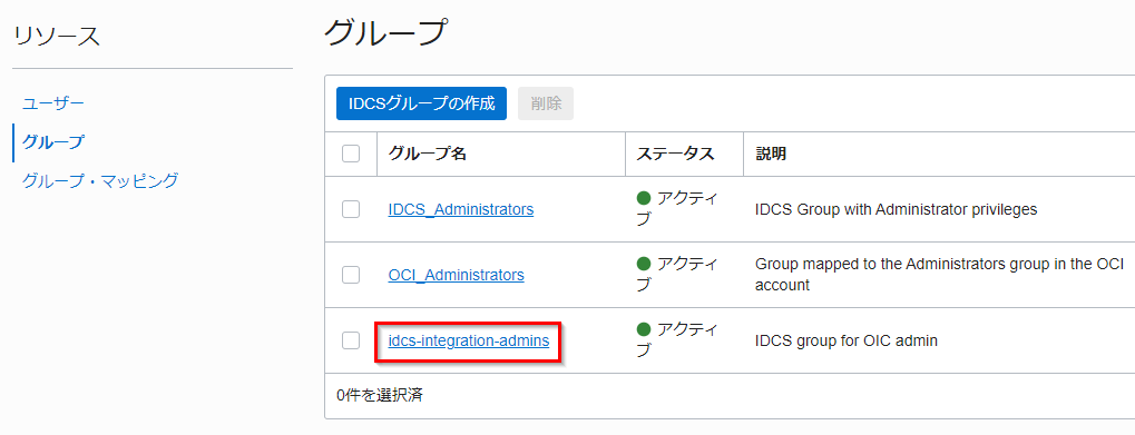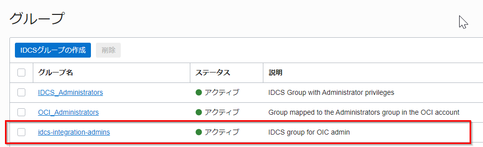 | 名前 | idcs-integration-admins |