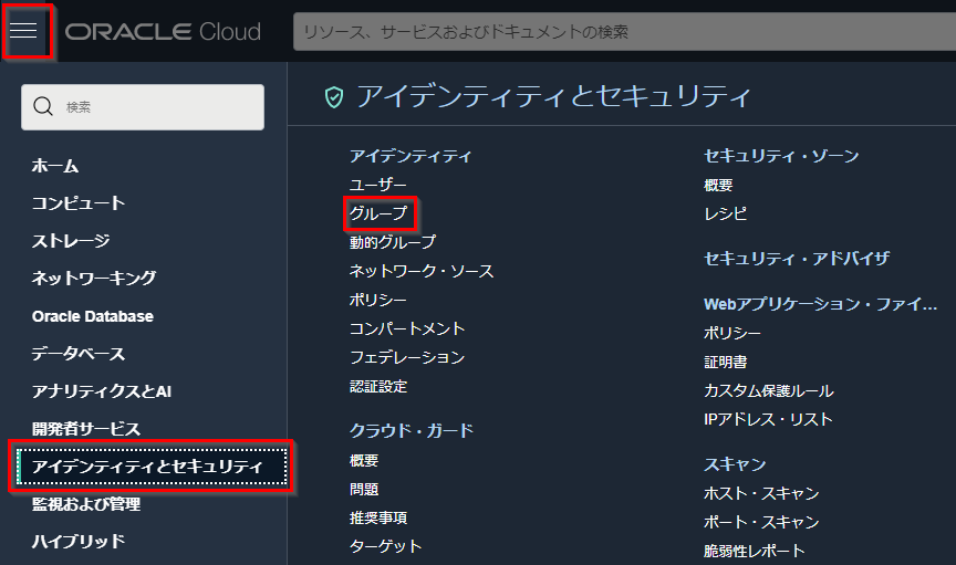 OCI コンソールの左上のナビゲーションメニュー →アイデンティティ→グループをクリックします。
