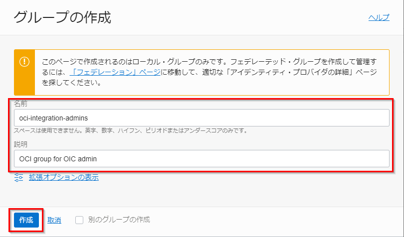 ここでは、以下の表に示す OIC インスタンスの作成及び管理を実行するグループを作成し、そこに管理ユーザーを割り当てます。