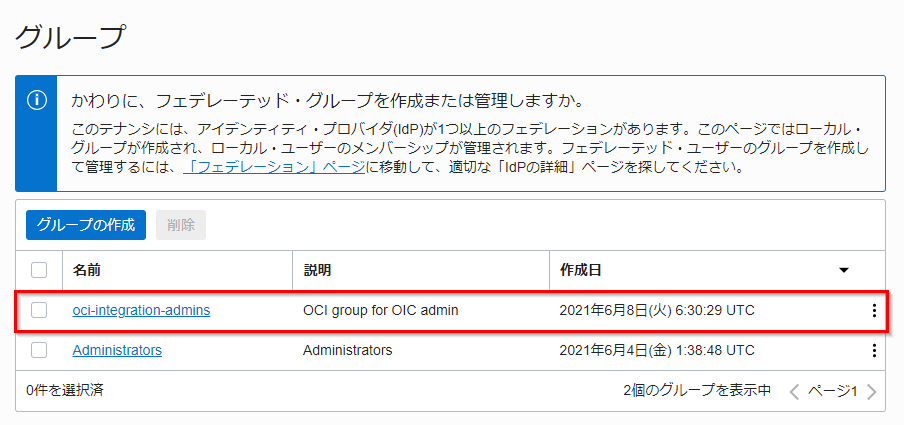 oci-integration-admins グループが作成されることを確認します。