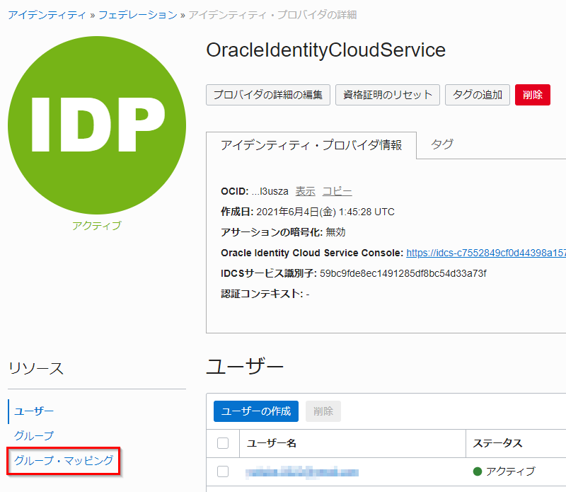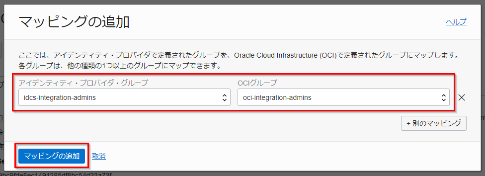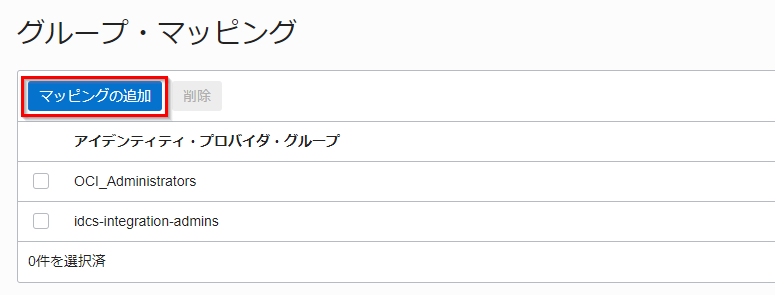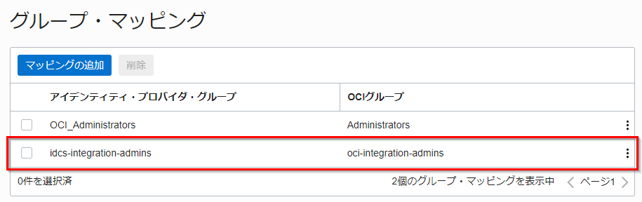 グループ・マッピングが作成されることを確認します。 これにより、 IDCS グループの idcs-integration-admins に所属する IDCS ユーザーは、自動的に OCI グループの oci-integration-admins に所属することとなります。