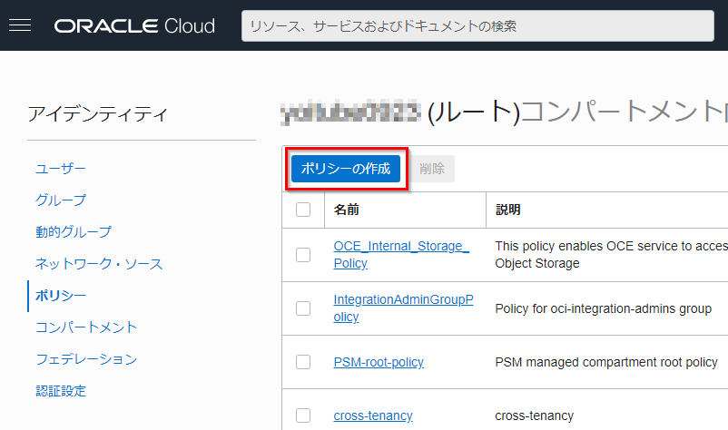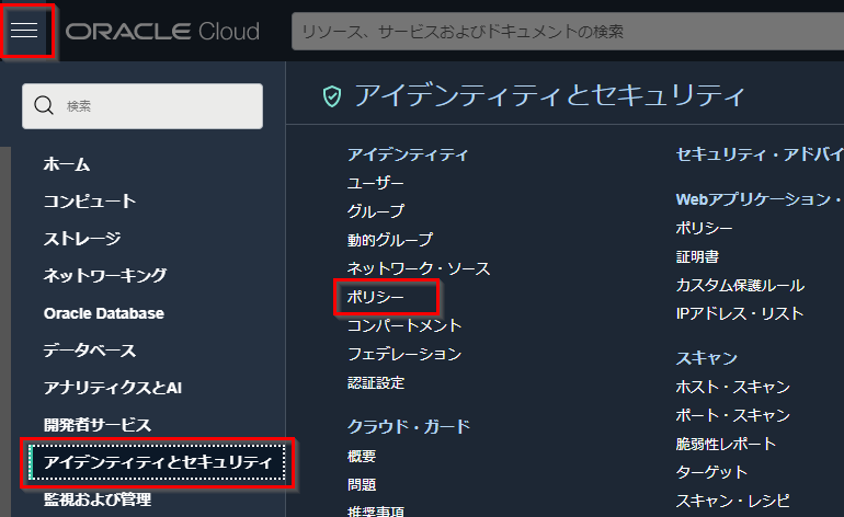 OCI コンソールの左上のナビゲーションメニュー →アイデンティティ→ポリシーをクリックします。