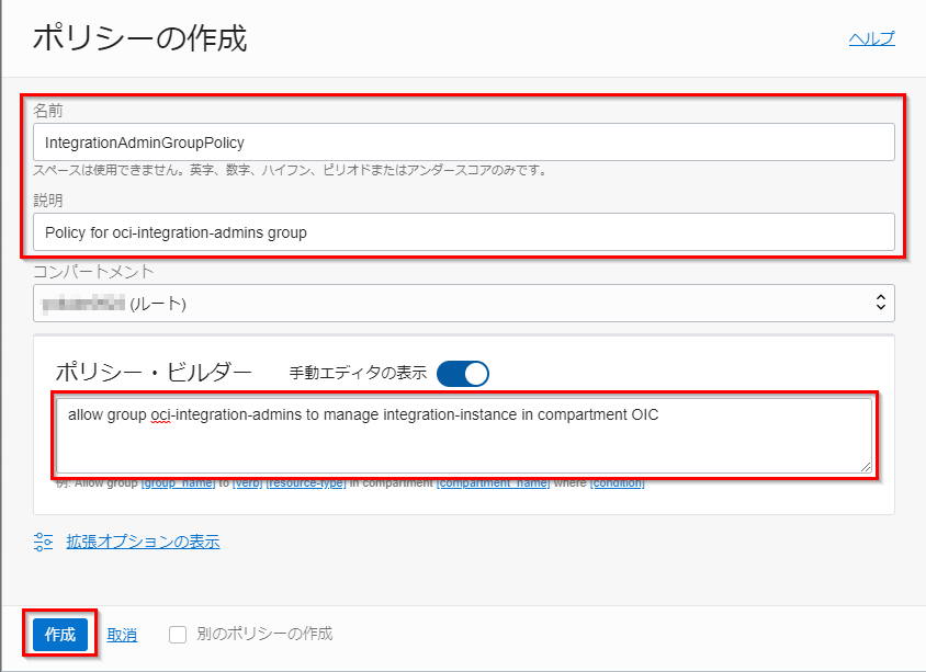 | ポリシー・ビルダー | allow group oci-integration-admins to manage integration-instance in compartment OIC |