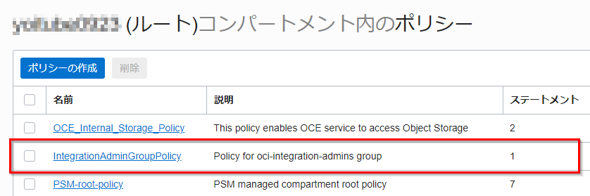 | 説明 | Policy for oci-integration-admins group |