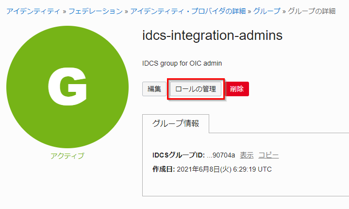 idcs-integration-admins グループを開いたまま、ロールの管理をクリックします。
