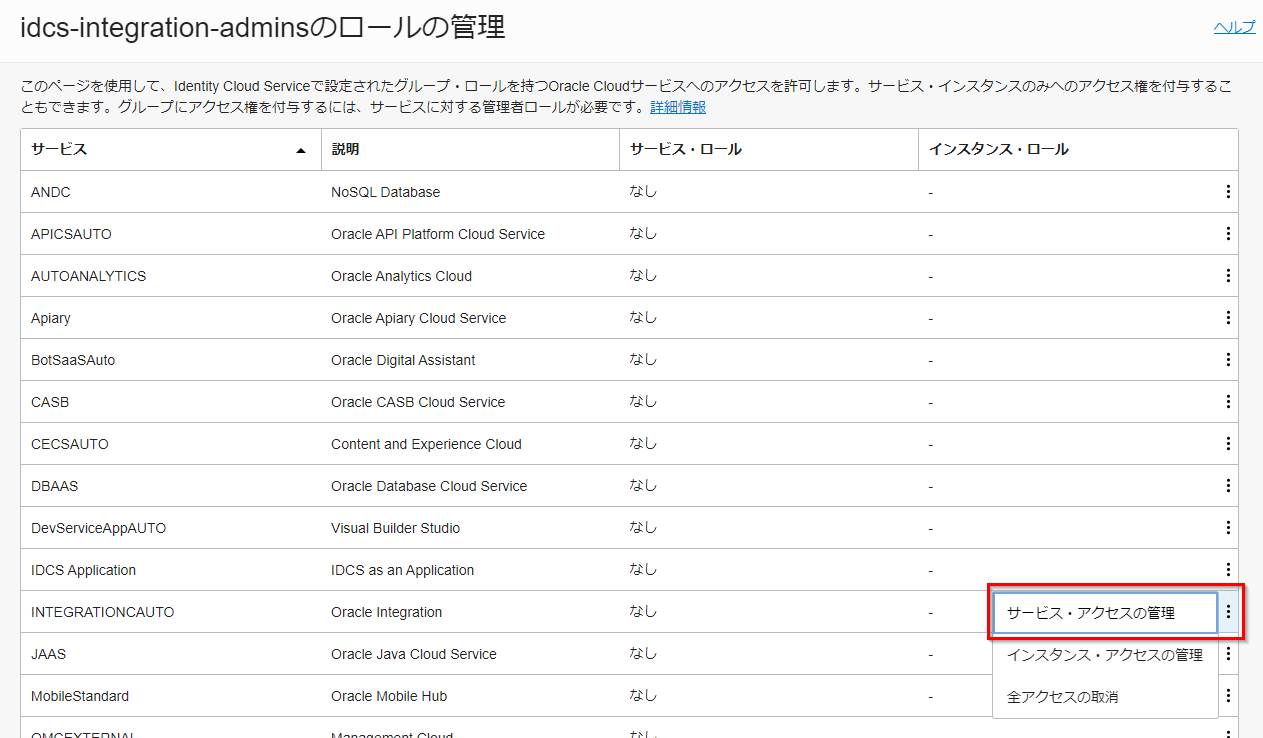 INTEGRATIONAUTOを探し、右端のメニューをクリック →サービス・アクセスの管理をクリックします。
