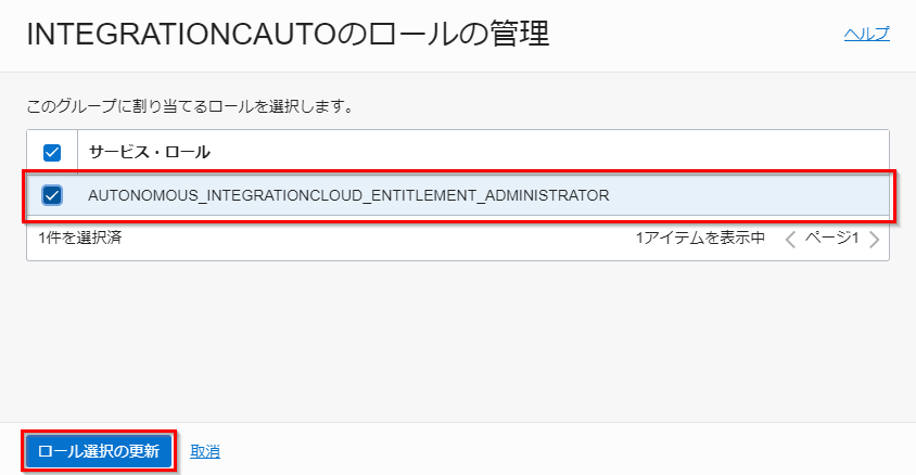 AUTONOMOUS_INTEGRATIONCLOUD_ENTITLEMENT_ADMINISTRATORを選択し、ロール選択の保存をクリックします。