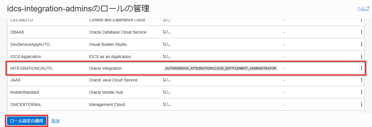 AUTONOMOUS_INTEGRATIONCLOUD_ENTITLEMENT_ADMINISTRATORが選択されていることを確認し、サービス・ロール設定の適用をクリックします。