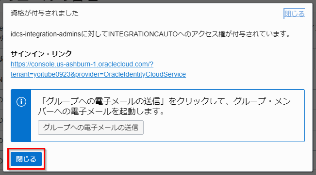 以上で、idcs-integration-admins グループに所属する IDCS ユーザーが、OIC インスタンスの管理と OIC インスタンスの利用ユーザーの管理の両方が、OCI コンソールから操作できるようになりました。