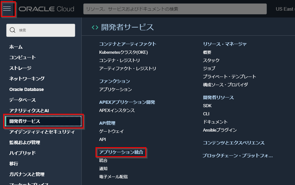 OCI コンソールを開きます。 OIC インスタンスを作成するリージョンを選択します。ここでは US East (Ashburn) を選択