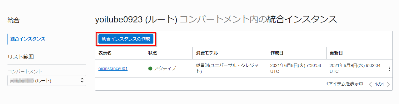 コンパートメントを選択し、統合インスタンスの作成をクリックします。ここでは前の手順で作成した OIC コンパートメントを選択します。