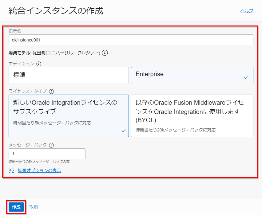 入力項目 説明 表示名 OIC インスタンスの表示名。OIC インスタンスにアクセスする際の URL に含まれます。 エディション 標準 or ENTERPRISE より選択。エディションごとに利用できる機能の違いは、こちらのマニュアルをご参照ください。 ライセンス・タイプ 新しい OIC ライセンスのサブスクライブ or 既存の FMW ライセンスを OIC に使用します(BYOL) より選択 メッセージ・パック メッセージパック数を選択。ライセンスタイプにより、1 パックあたりのメッセージ数が異なります。