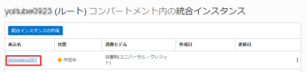 OIC インスタンス作成が開始されます。プロビジョニング中のインスタンス名をクリックします。