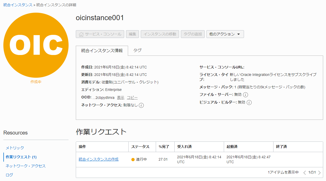 プロビジョニング中の OIC インスタンスの詳細が確認できます。インスタンスが作成中であることを確認します。 また、作業リクエストのステータスが進行中で、%完了が 0 より大きい数値となっていることを確認します。