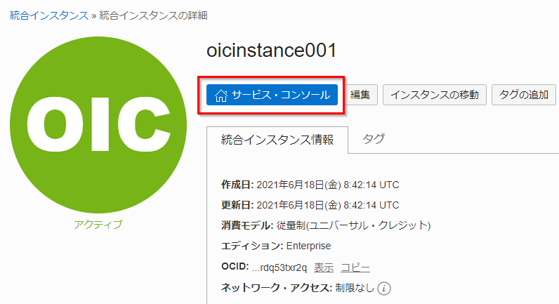 インスタンスがアクティブであることを確認し、サービス・コンソールをクリックします。