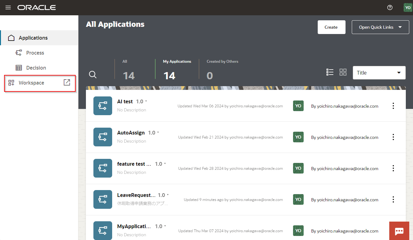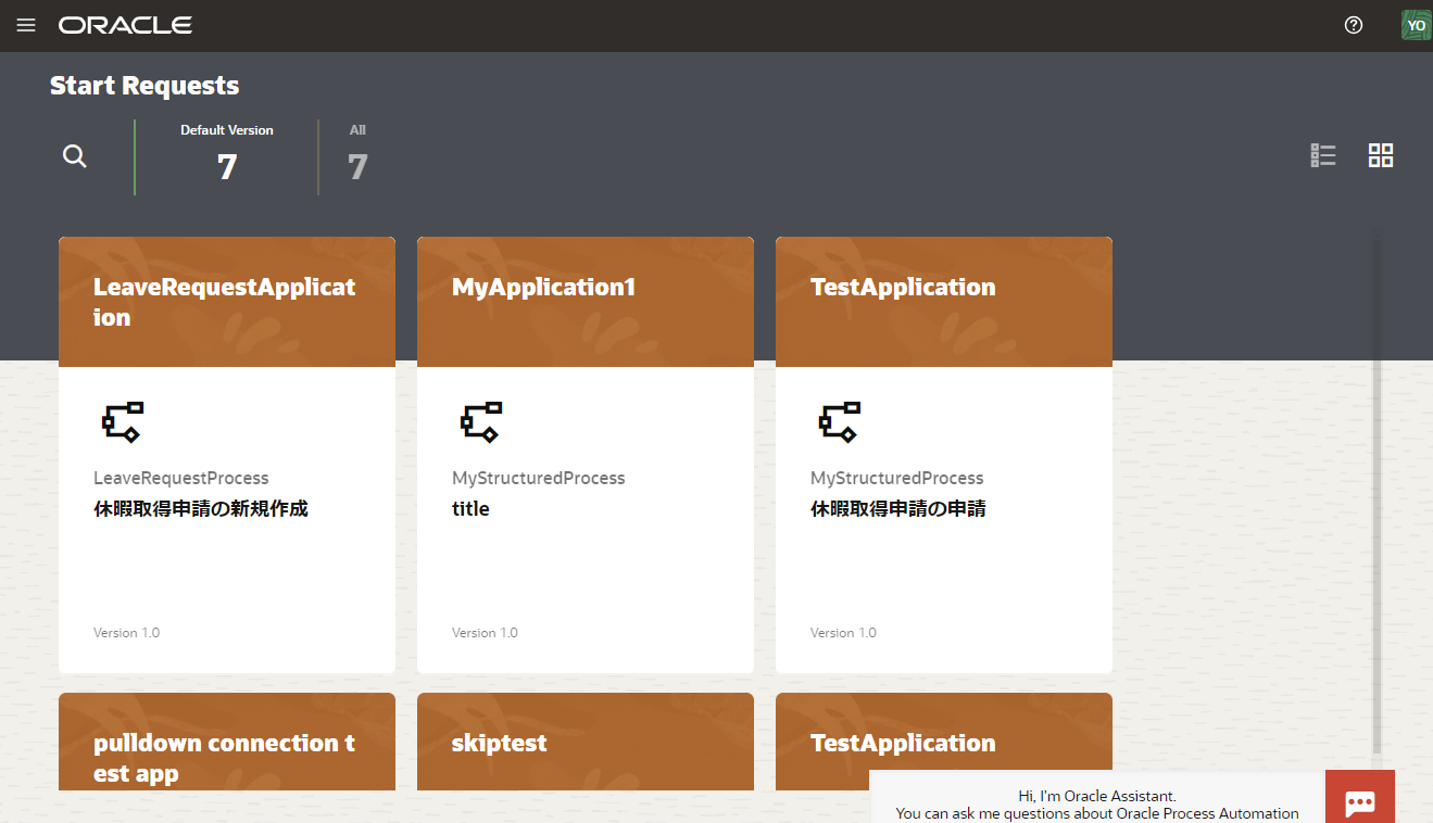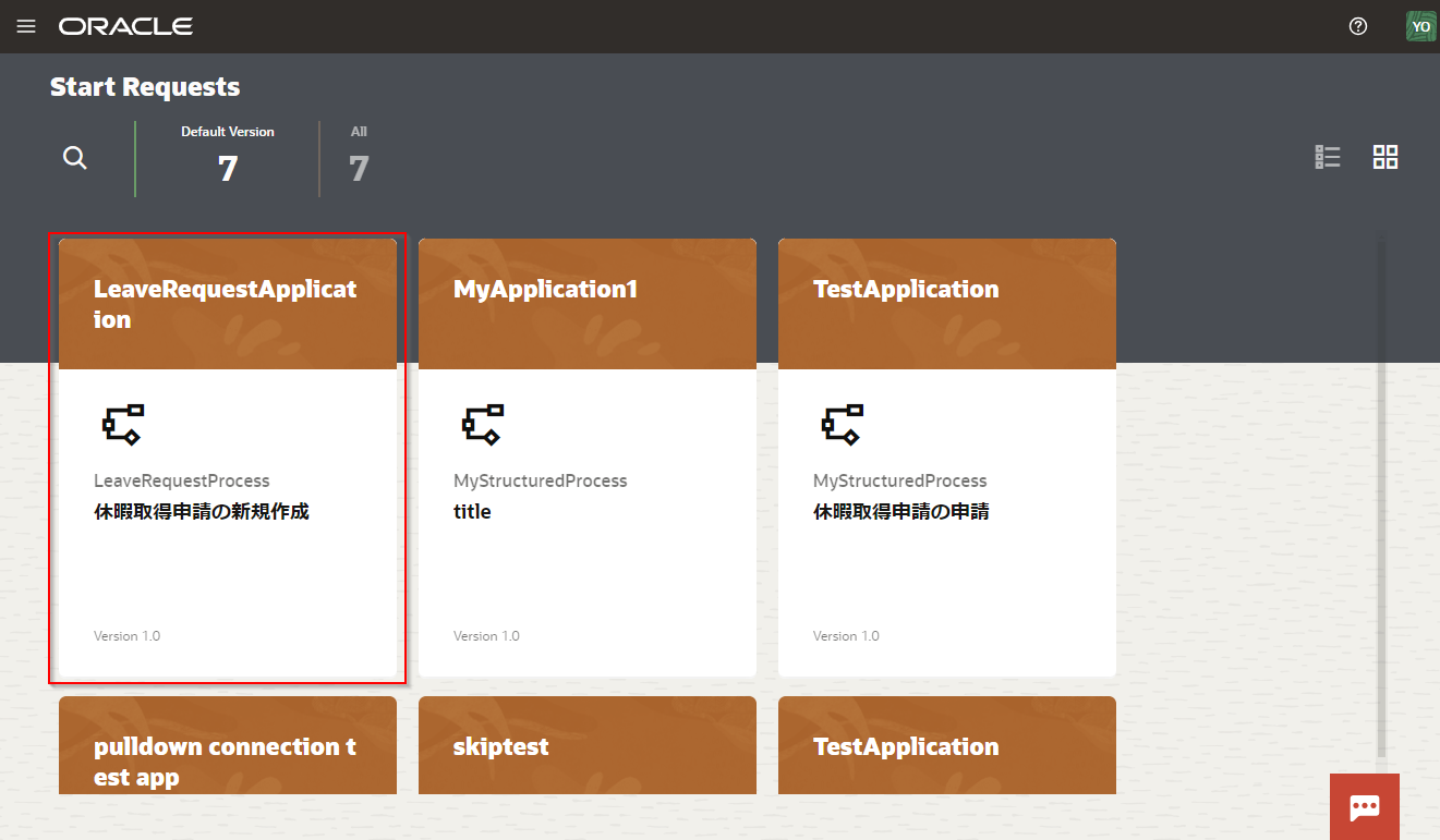 その中からOracle Cloud Infrastructure Process Automation で簡単なワークフローを作成してみよう(作成編)で作成したアプリケーションを探してクリックします。手順の通りであればLeaveRequestApplicationの名前のアプリケーションです。