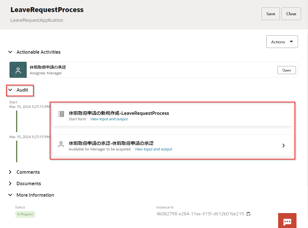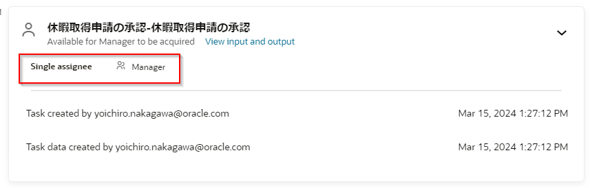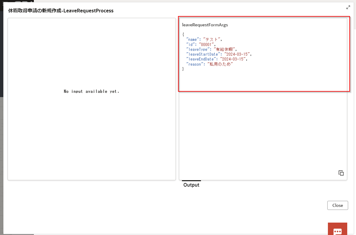 「View input and output」を押すと申請や承認時に入力された値を確認することができます。
