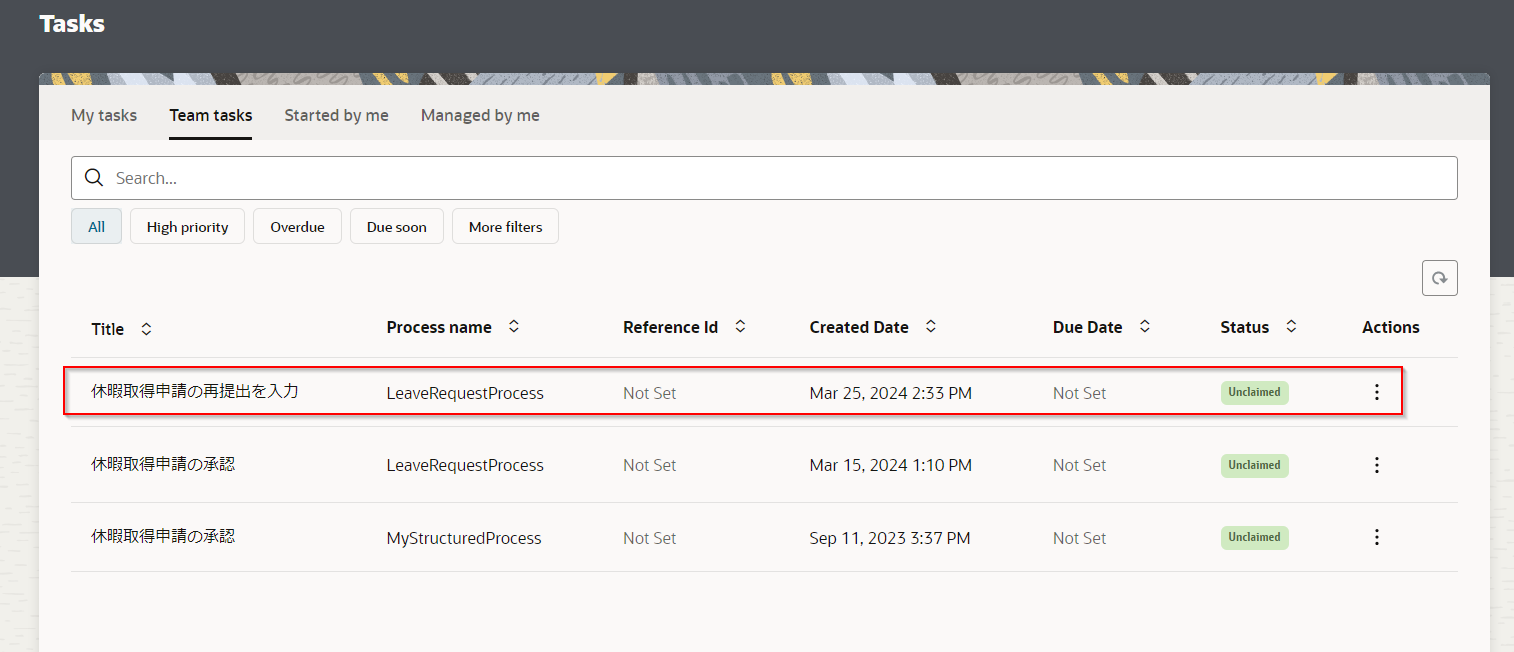 左のメニューから「Tasks」-「Team Tasks」を選択し、先ほど拒否をしたプロセスが「休暇取得申請の再提出を入力」という名前で表示されます。