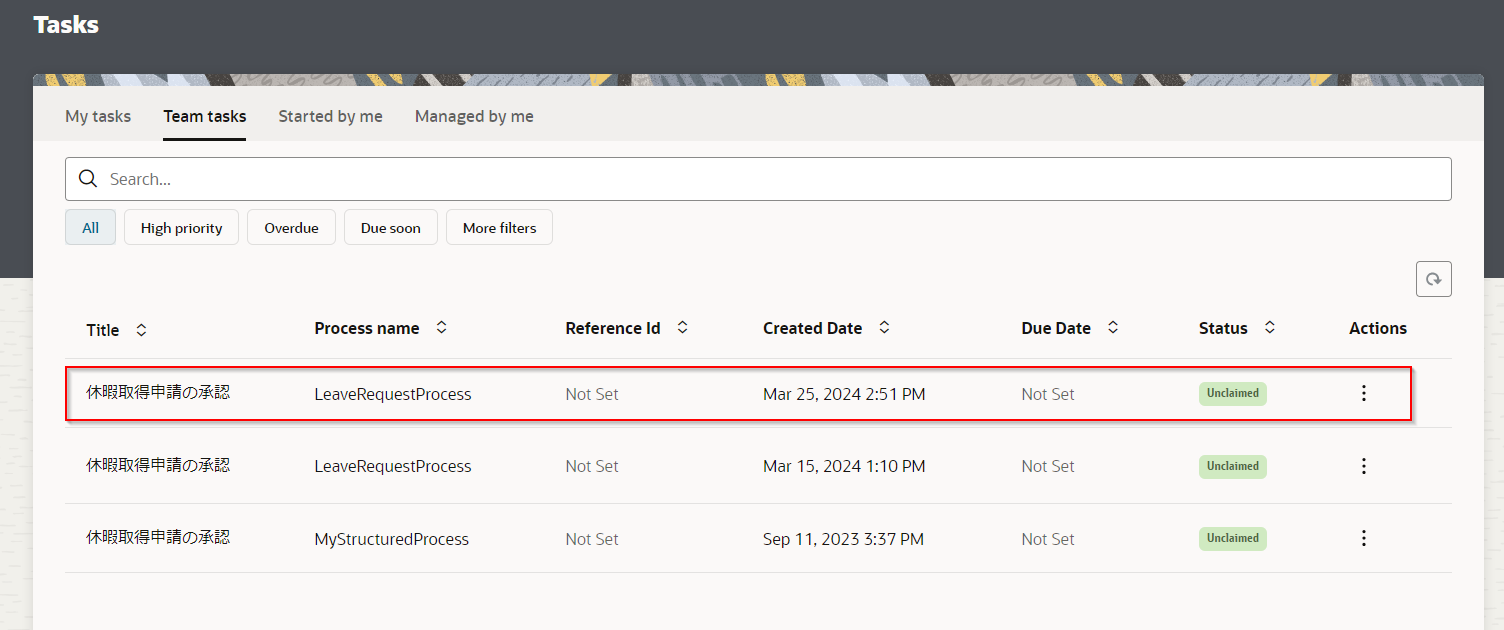 My tasksとTeam tasksについてタスクが個人単位でアサインされている場合、My tasksに表示されます。タスクにアサインしているのがRoleの場合はTeam tasksにタスクが表示されます。今回の場合はApproveというRoleをタスクに割り当てているのでTeam tasksからタスクが確認できます。