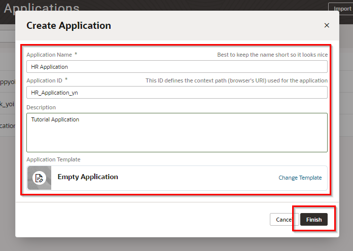 値を設定したら、「Create Application」 ダイアログ・ボックスの 「Finish」 ボタンをクリックします。