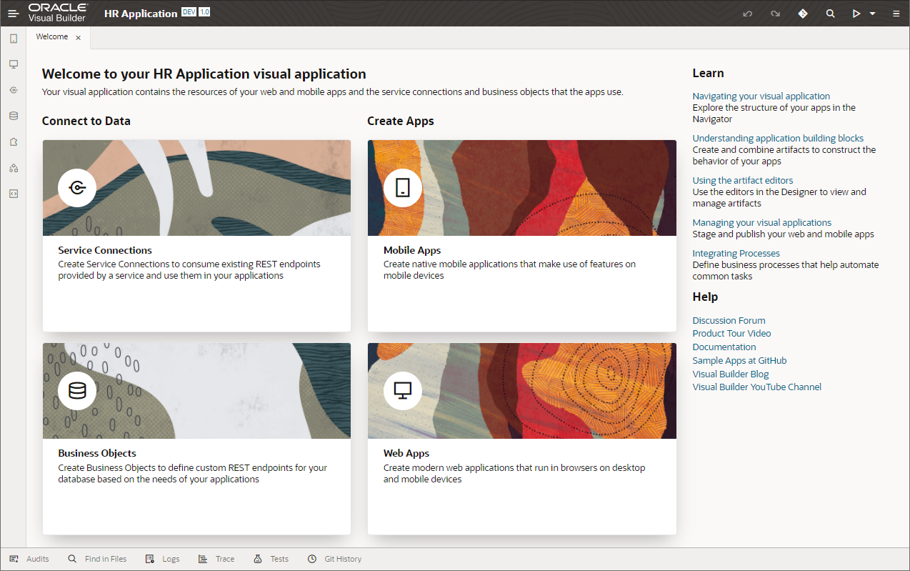ビジュアル・アプリケーションが作成されると、VBCSのアプリケーション・デザイナでビジュアル・アプリケーションがオープンします。 アプリケーション・デザイナにはアーティファクト・ブラウザとWelcomeスクリーンが表示されます。 Welcomeスクリーンには、VBCSでアプリケーションを作成するためのタスクのガイドが表示されます。
