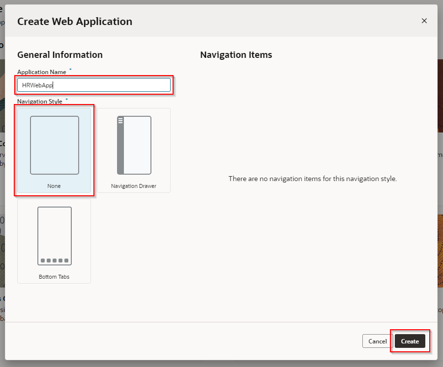 「Create Web Application」 ダイアログ・ボックスが表示されたら、 「Application Name」 フィールドに 「HRWebApp」 と入力し、 Navigation Style に 「None」 を選択し、 「Create」 ボタンをクリックします。