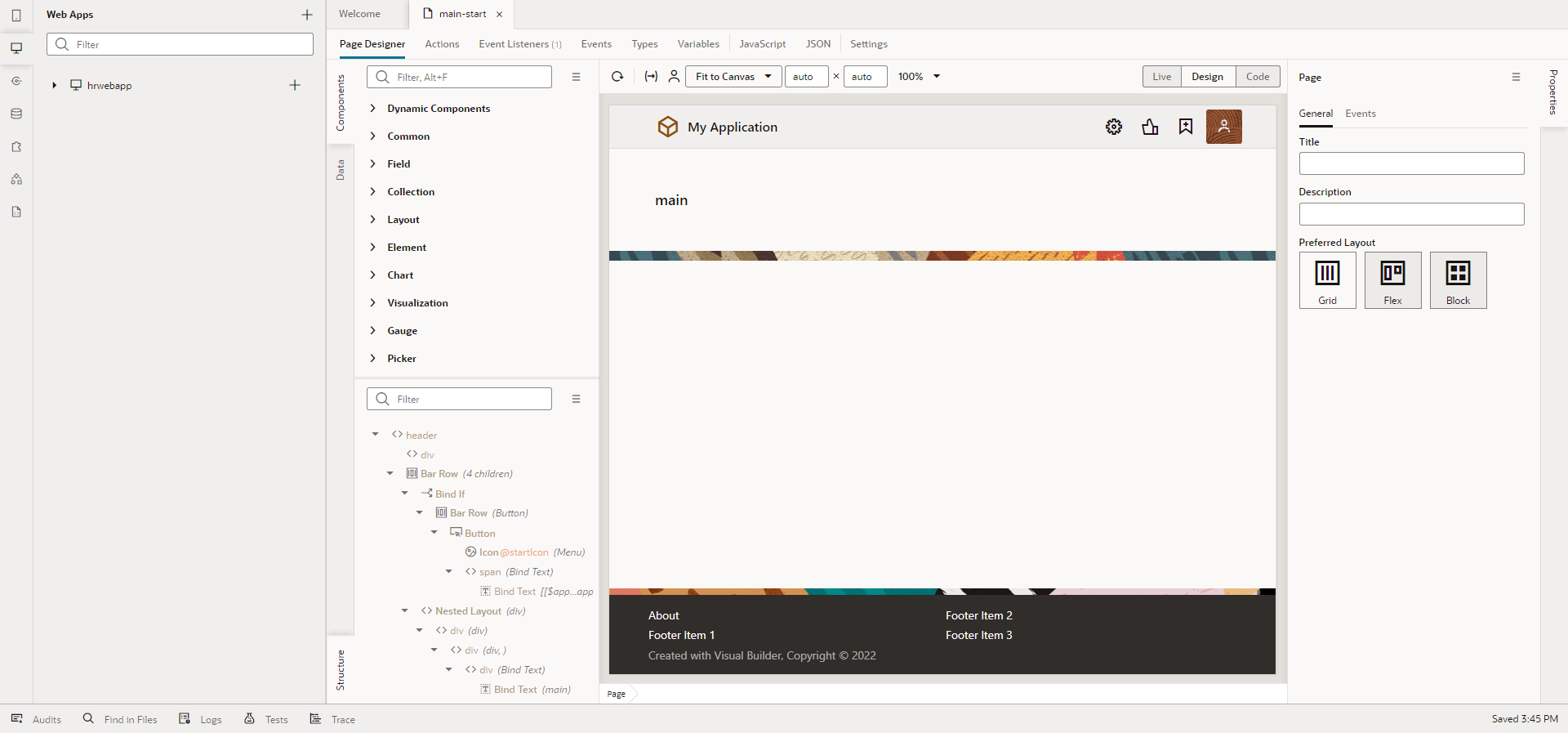 HRWebApp のアーティファクトが生成されます。 ページ・デザイナで表示されている 「main-start」 が、アプリケーションの起動時に最初に表示される画面です。