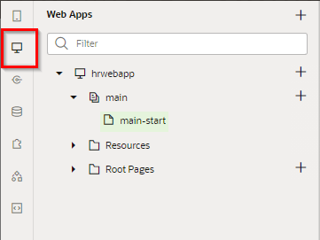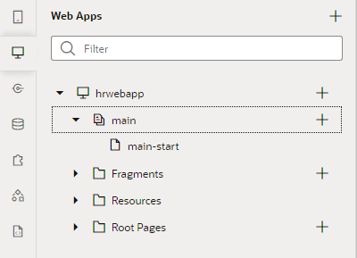 アーティファクト・ブラウザで 「hrwebapp」 ノードを展開するとWebアプリケーションの構造が表示されます。 「main」 ノードを展開すると 「main-start」 ページが表示されます。