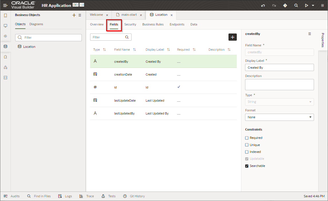 ビジネス・オブジェクトが作成されたら、 「Fields」 タブをクリックします。 5つのフィールドが定義されています。