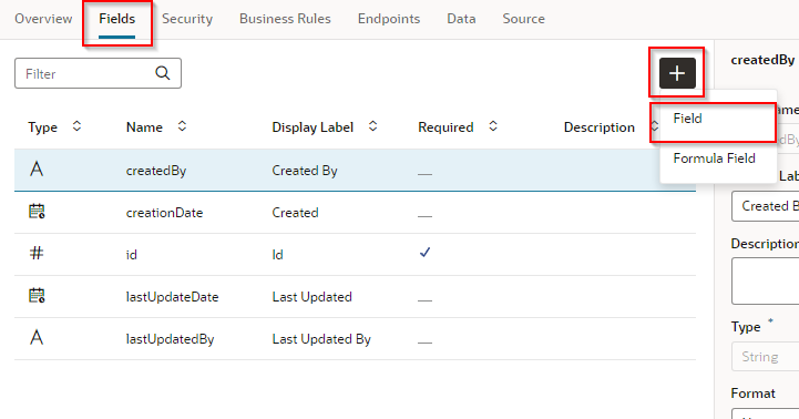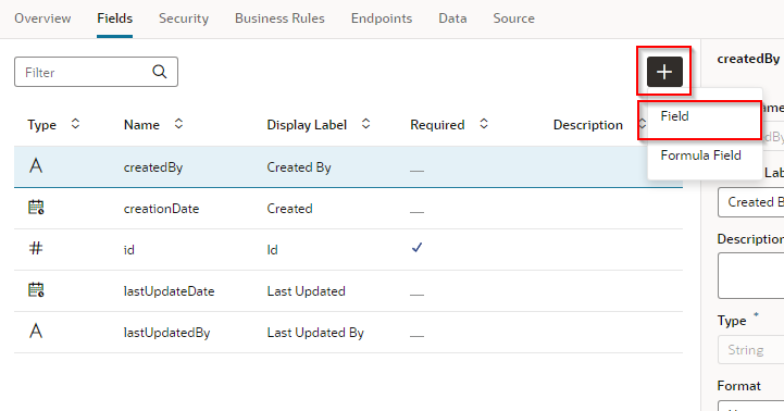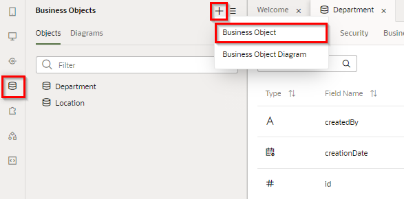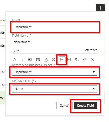 ビジネス・オブジェクト Department の「Fields」 タブ・ページの 「+」 ボタンから「Field」をクリックします。