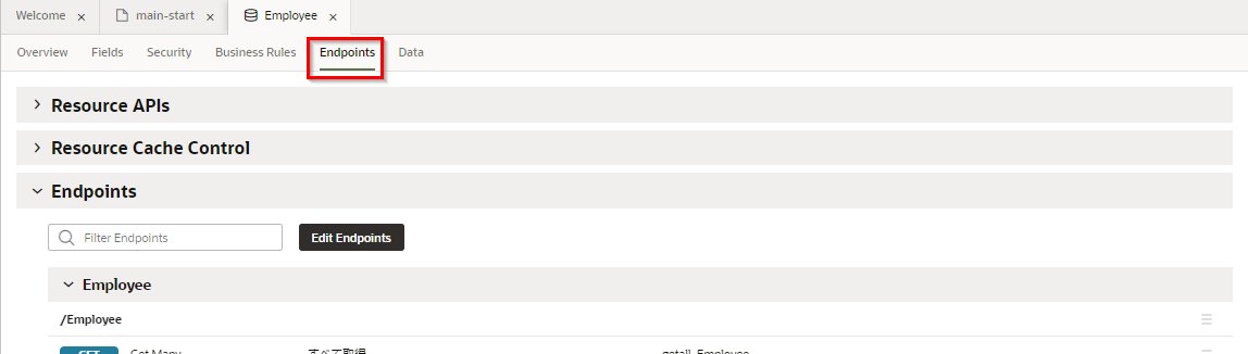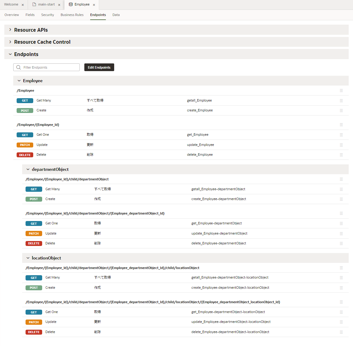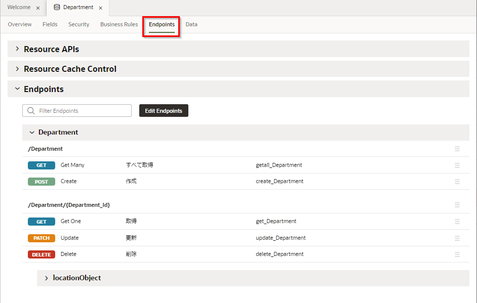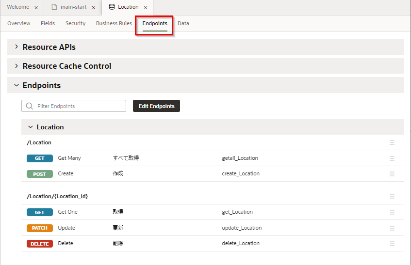「Endpoints」 タブ・ページを開くと、このビジネス・オブジェクトのデータの参照、作成、更新、削除のための REST API のエンドポイントが一覧できます。