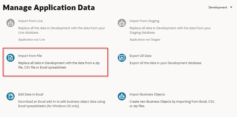 「Data Manager」 タブ・ページが表示されます。 「Import from File」 ボックスをクリックします。