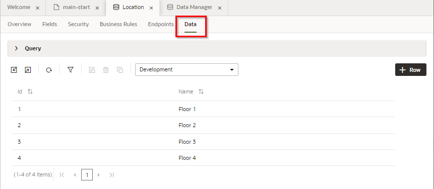 アプリケーション・ナビゲーション・エリアの 「Business Objects」 タブ・ページで、 「Location」 を選択します。 「Data」 タブ・ページを開くと、追加されたレコードが表示されます。