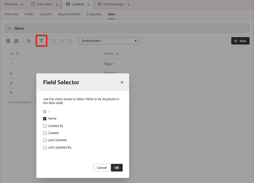 「Add Edit Page」 ダイアログ・ボックスで 「Finish」 ボタンをクリックすると、Departments ページの タイトルと Table コンポーネントの間の Toolbar コンポーネントの中には、「編集」 ボタンが配置されています。 追加された 「編集」 ボタンは、テーブルでレコードが選択されるまでは無効化されています。