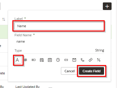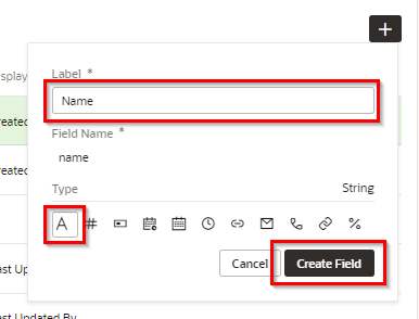 ポップアップ・ボックスが表示されたら、追加するフィールドに以下の内容を設定し、 「Create Field」 ボタンをクリックします。