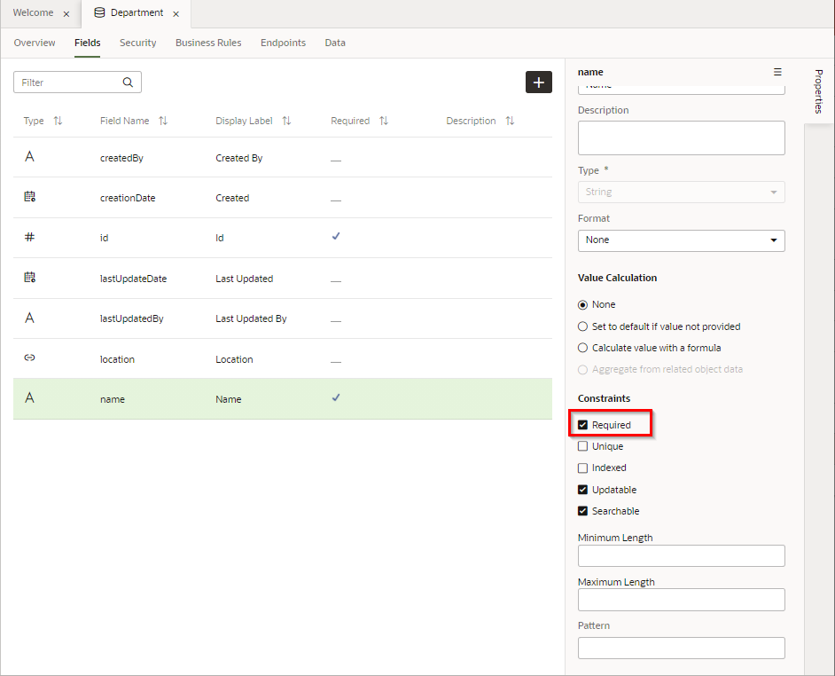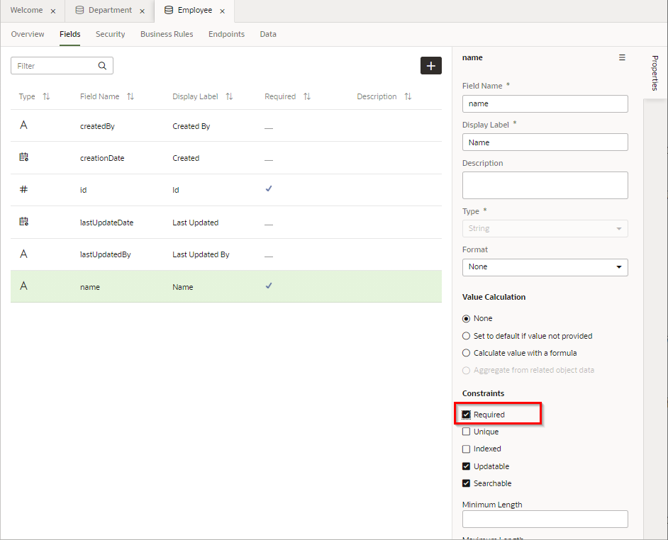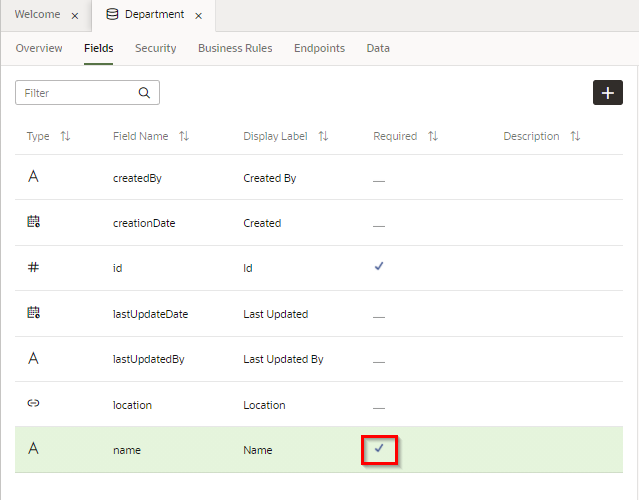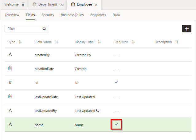 プロパティ・エディタで 「Required」 をチェックすると、追加されたフィールド Name は必須データ項目に設定されます。 「Required」 列にチェック・マークが表示されていることを確認します。