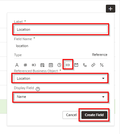次は同様の手順でフィールド locationを作成します。 ビジネス・オブジェクト Department の「Fields」 タブ・ページの 「+」 ボタンから「Create Field」をクリックし、ポップアップ・ボックスで以下の内容を入力します。